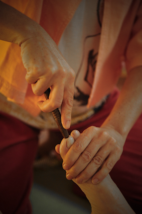 El modo de tocar y la utilización de un palito de teka en los puntos reflejos del pie hacen que el tratamiento además de ser gratamente relajante, tenga un fuerte efecto de desintoxicación para el organismo.